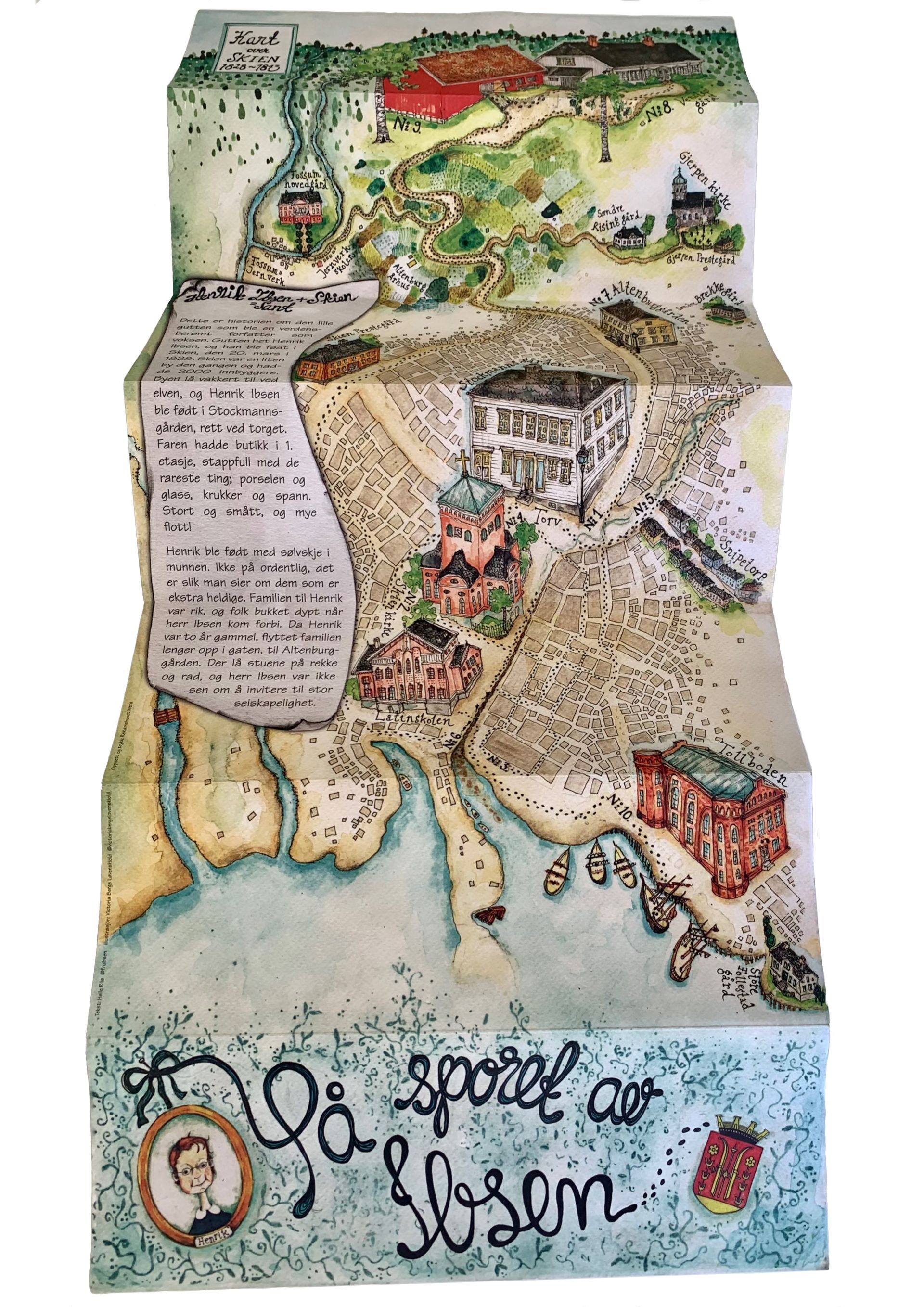 Side 1: Inneholder et illustrert kart over Skien (1828-1839) og en faktaboks om Henrik Ibsen og Skien.