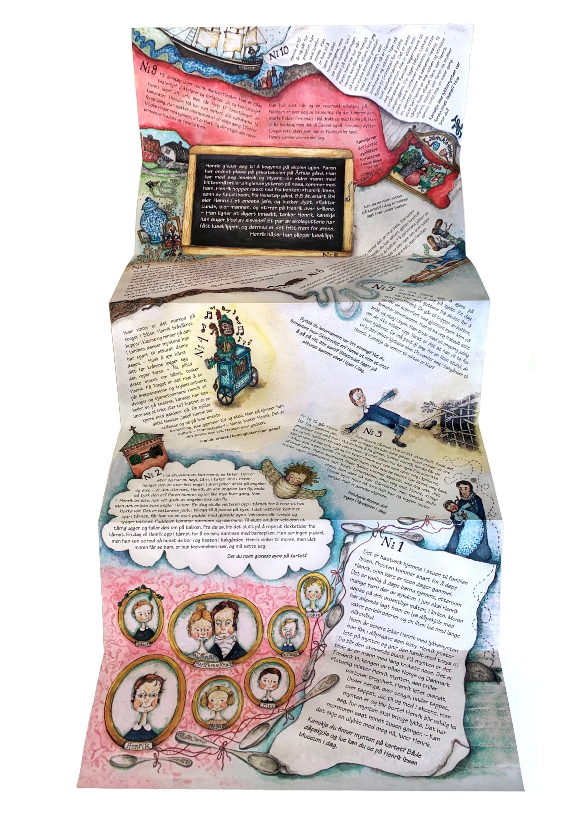 Folderen kan brukes til å følge Ibsens fotspor rundt i Skien, både på skolen, hjemme, eller på tur. Historiene er nummererte og matcher illustrasjonene, som igjen kan kobles til steder på kartet. Barna får et innblikk i Ibsens første 15 år, og hvordan barndommen kan ha påvirket hans senere forfatterskap.